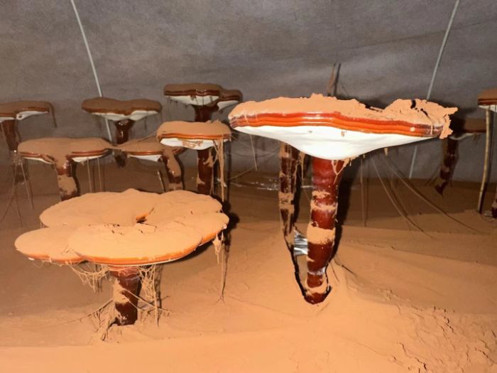 更令人震撼的畫卷在下符橋鎮靈芝種植基地展開。時值八月,正值靈芝噴粉的黃金季節。放眼望去,數百座標準化靈芝大棚整齊排列,綿延不絕,蔚為壯觀,構成了一片孕育生命奇跡的獨特“森林”。團隊成員深入大棚,近距離觀察并詳細記錄了靈芝孢子粉的采集過程:工人們小心翼翼地覆蓋特制收集膜,待飽含精華的孢子粉自然彈射附著后,再進行專業的收集、篩選與儲存。