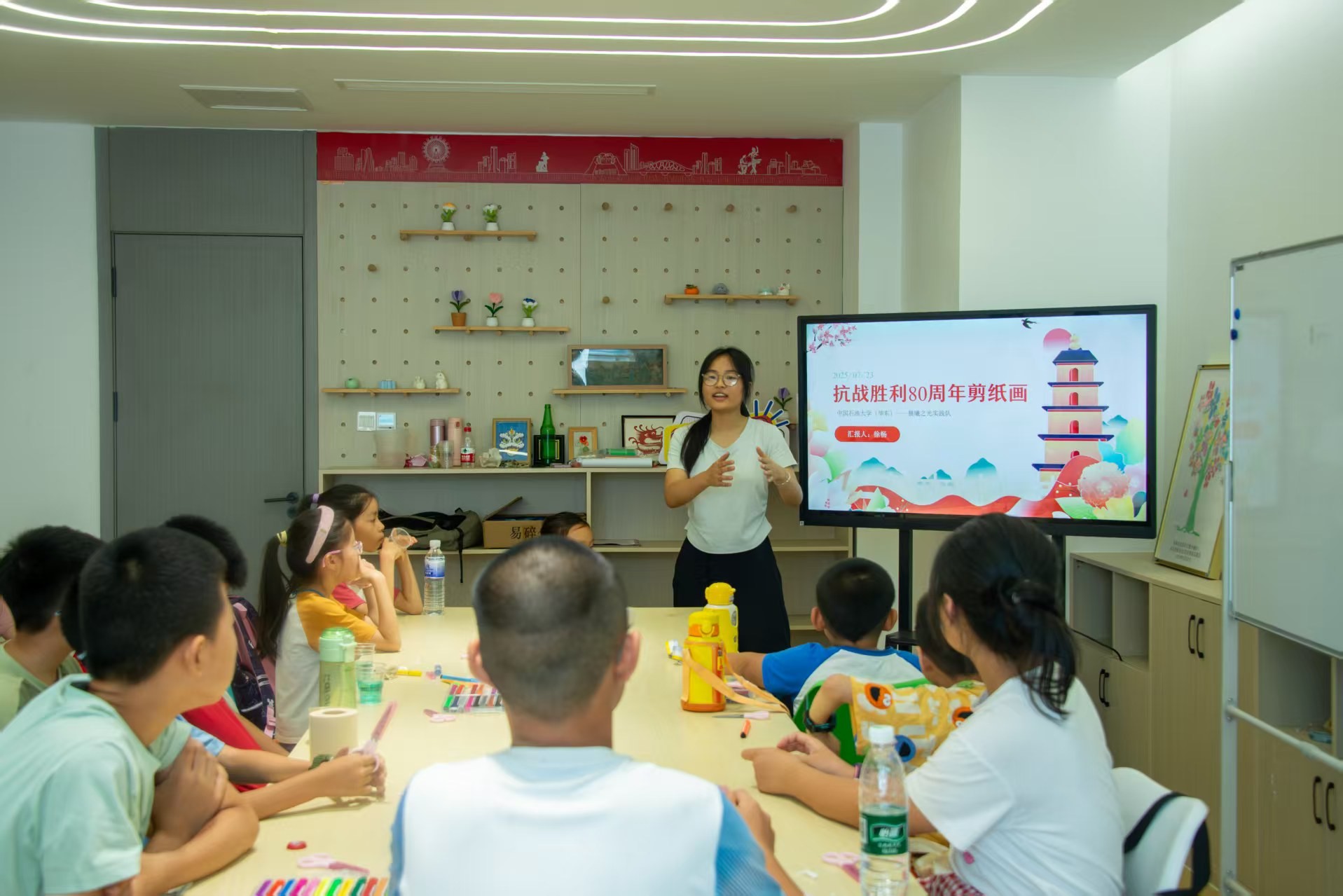 課桌上,彩紙、剪刀整齊排列,孩子們圍坐成圈,眼里滿是期待。8歲的李同學(xué)是第一次使用剪刀,指尖微微發(fā)抖,徐暢見狀,立刻俯下身,手把手帶著她調(diào)整姿勢、控制力度。半小時后,當(dāng)“白鴿銜著橄欖枝”的剪紙作品在手中成型時,李同學(xué)興奮地舉起作品歡呼,還特意貼上“1945-2025”的紀(jì)念貼紙,紀(jì)念抗戰(zhàn)勝利八十周年。