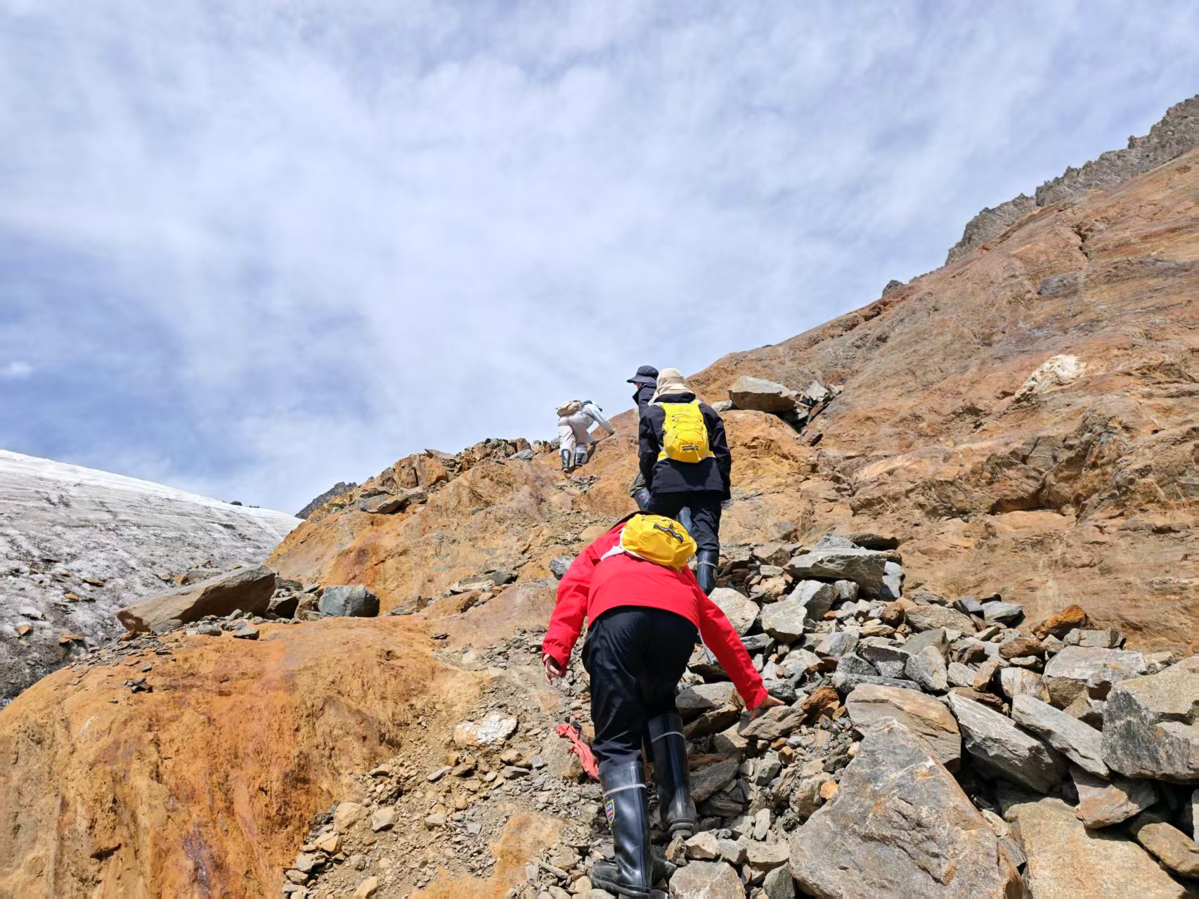頂著山間寒風,身著專業戶外裝備的實踐團隊,在天格爾峰腳下開啟了與冰川的 “深度對話”。崎嶇山路上,碎石遍布、坡陡路滑,隊員們相互攙扶、彼此鼓勁,每一步都走得堅定而扎實;巍峨山體旁,他們抬頭仰望冰峰,探索自然的決心在眼眸中熠熠生輝。姜江瑞通訊員