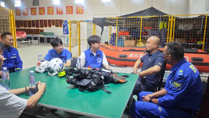 “這些裝備是救援人員的‘戰(zhàn)友’,每一個(gè)細(xì)節(jié)都關(guān)乎生命安全。”副隊(duì)長的講解讓團(tuán)隊(duì)成員對專業(yè)救援體系有了更直觀、深刻的認(rèn)知。隨后,調(diào)研團(tuán)成員現(xiàn)場展示了自主研發(fā)的水域安全防護(hù)裝置,從裝置的設(shè)計(jì)理念、核心功能到適用場景,逐一進(jìn)行介紹。副隊(duì)長結(jié)合一線救援經(jīng)驗(yàn),從實(shí)戰(zhàn)角度提出改進(jìn)建議:“在水流湍急的區(qū)域,裝置的固定穩(wěn)定性還需加強(qiáng);夜間救援時(shí),發(fā)光警示功能可以再優(yōu)化,方便救援人員快速定位。”這些貼合實(shí)際需求的建議,為裝置后續(xù)迭代升級指明了清晰方向。