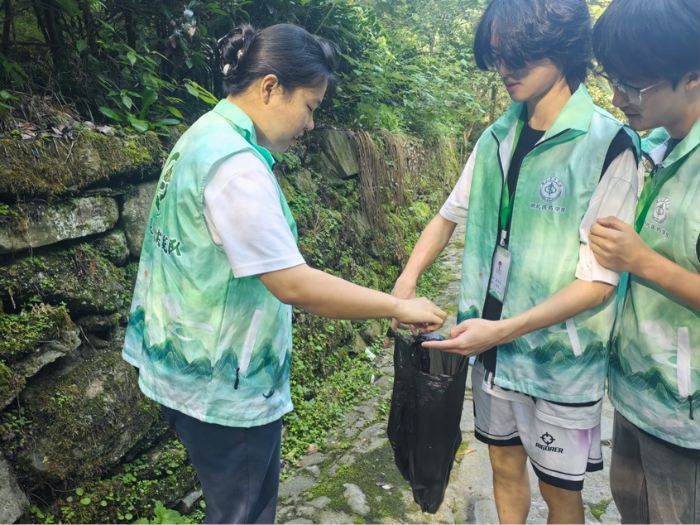 徒步過程中,隊員們不忘將“環保”融入行動。他們手持環保袋,仔細搜尋著沿途的塑料瓶、紙屑、包裝袋等垃圾。“邊走邊撿”成為他們踐行環保理念的獨特方式。哪怕是藏在草叢深處的一片小紙屑,或是卡在石縫里的煙頭,都逃不過隊員們的眼睛。大家深知,這些看似微小的垃圾,若長期留在森林中,不僅會破壞自然景觀的美感,還可能對土壤、水源以及動植物的生存環境造成威脅。