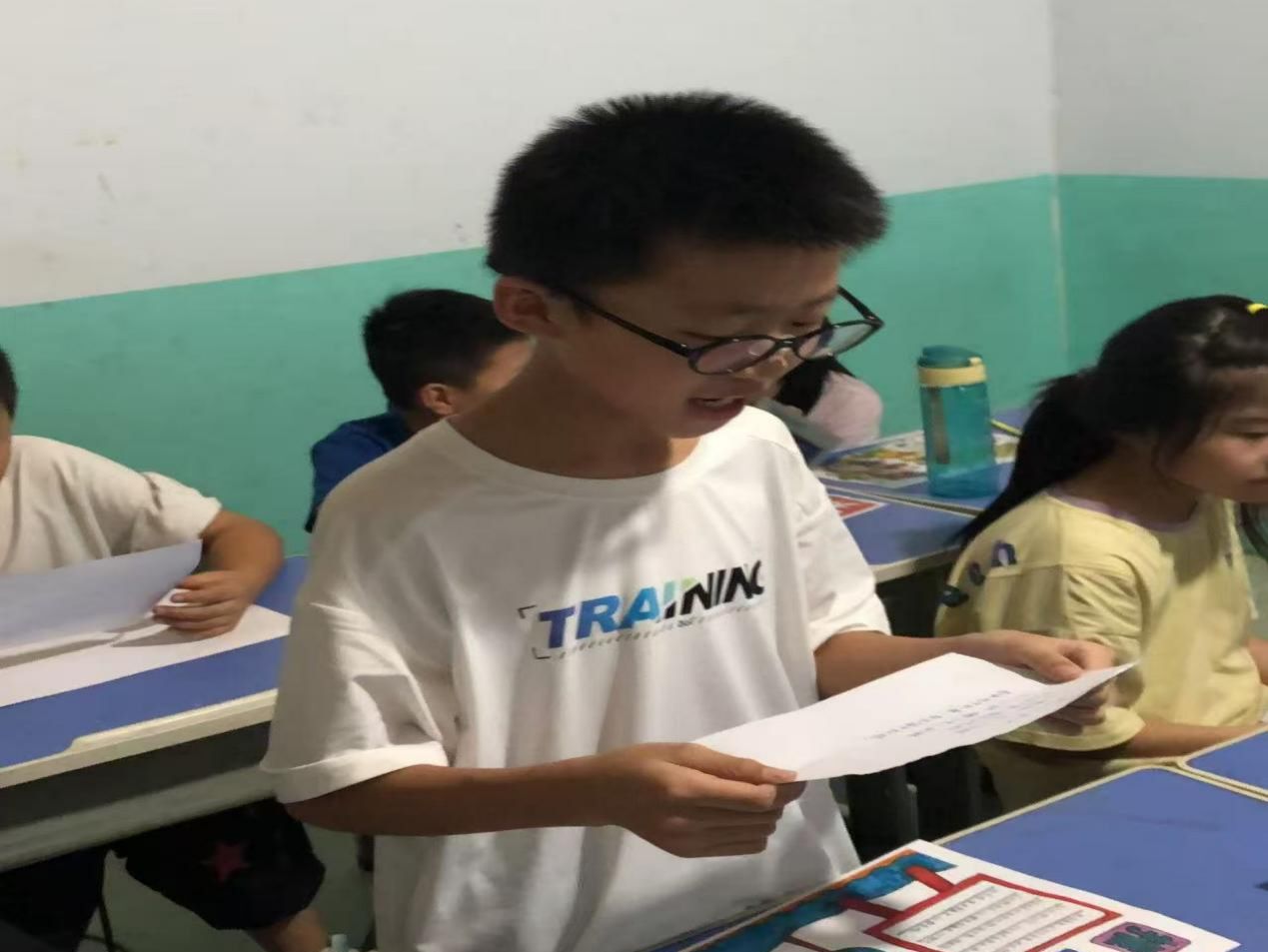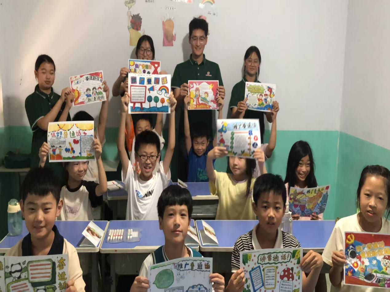 為破解這些問題,實踐團量身設計“推普+青少年語言文化素養”特色活動,把課堂變成了充滿歡聲笑語的“語言樂園”;顒右潦,隊員們結合升學考試、外出研學等案例,向師生講解普通話的重要性,并現場演示國家通用語言學習平臺的使用方法,為大家打通線上學習渠道。隨后的互動環節更是熱鬧非凡:在“推普手抄報創作”中,孩子們用彩筆描繪“說好普通話,走遍天下都不怕”的愿景,一張張色彩鮮艷的作品鋪滿課桌;在“繞口令挑戰”中,“八百標兵奔北坡”“粉紅墻上畫鳳凰”的朗朗聲此起彼伏,孩子們在比拼中感受普通話的韻律美。