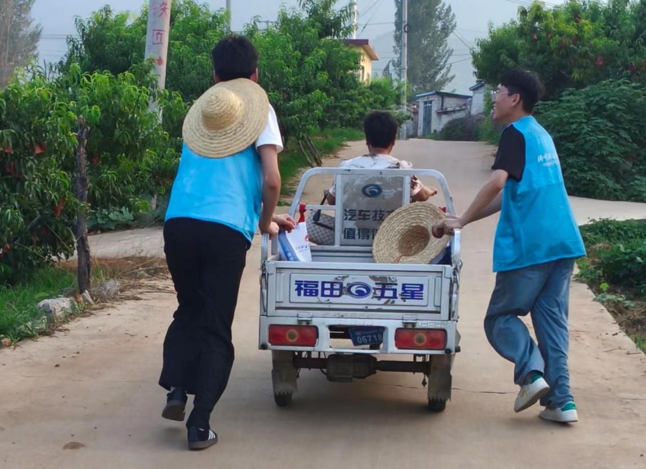 圖為梁晨、張恒睿幫助村民推車。尹延璐 攝