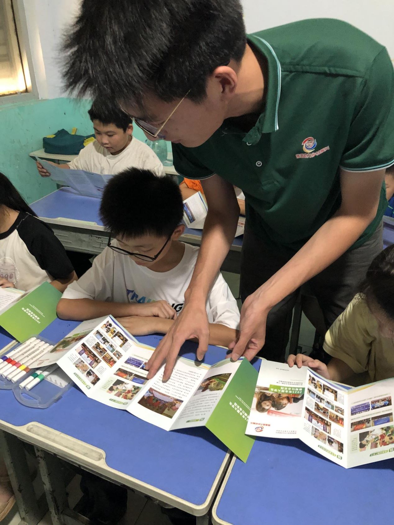 圖為團隊成員們指導小學生們繪制推普手抄報。劉樂彤 攝
