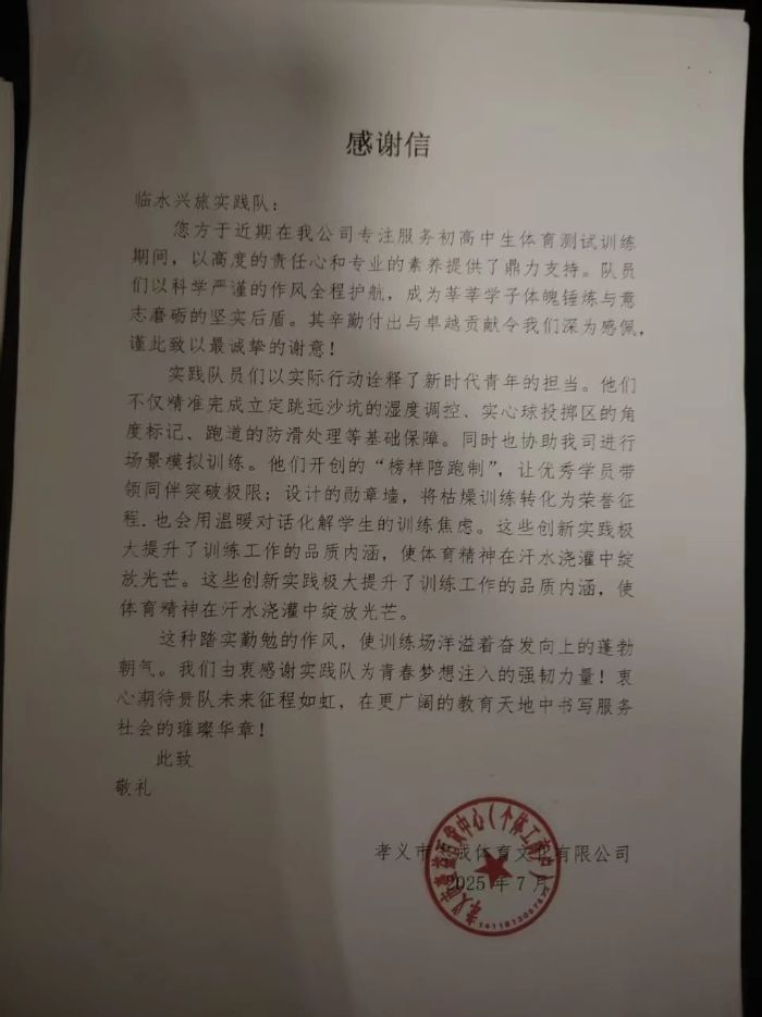 此次活動,孝義志成體育文化有限公司與孝義逐夢體育文化有限公司為臨水興旅隊送來感謝信,信中,公司負責人對志愿者們的專業付出與愛心行動表達了由衷感謝,這張感謝信,不僅是對我院志愿者們的肯定,更串聯起志愿力量與社會力量的溫暖聯結。當弓弦的回響漸漸散去,那份因熱愛而生的默契與合力,正悄悄為孩子們的成長之路,鋪就更多元、更廣闊的可能。