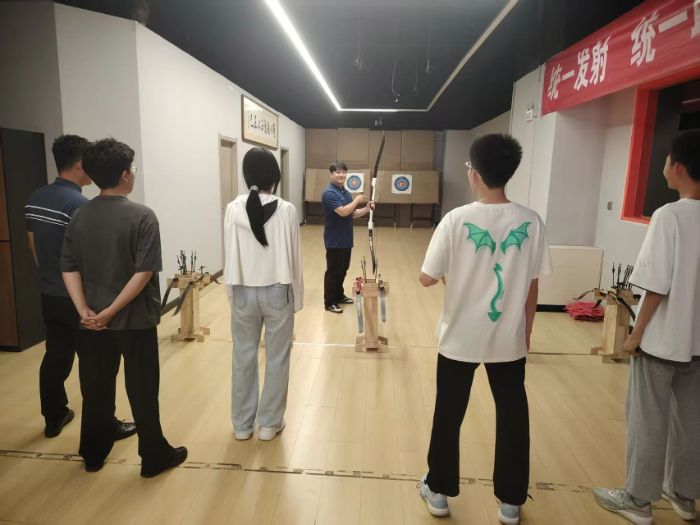 活動伊始,為了讓 “百步穿楊” 體驗營安全又有趣,他們提前勘察場地,反復檢查器械。開營時,教練志愿者跪在地上給孩子調整站位,講解激光射擊原理時,有人特意準備了手繪漫畫,使孩子們更好理解。活動中,臨水興旅隊志愿者先為孩子們講解射箭的基本禮儀與安全規范,并強調,射箭不僅是力量的較量,更是專注力的考驗,大家一定要記住,箭頭永遠不能對著自己或他人。隨后,他們手持反曲弓示范站立姿勢,從“丁字步”站位到“三點一線”瞄準法,每個動作都拆解得清晰易懂。孩子們聽得聚精會神,臉上滿是期待。分組練習時,志愿者們一對一指導,幫低年級的小朋友調整握弓手勢,提醒稍大的孩子控制拉弓力度,及時糾正歪頭、聳肩等小動作。