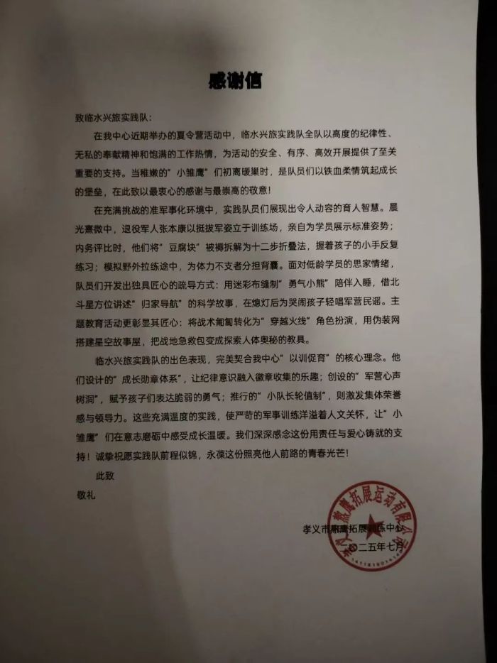此次三下鄉(xiāng)社會(huì)實(shí)踐,孝義市熬鷹拓展訓(xùn)練中心還為我院臨水興旅隊(duì)送來了感謝信,信中特別提到了志愿者們?cè)诹胰障路磸?fù)示范軍姿的耐心、手把手教疊“豆腐塊”時(shí)的細(xì)致,以及與孩子們相處時(shí)自然流露的真誠(chéng)。字里行間滿是對(duì)志愿者們的認(rèn)可與感謝,這份感謝信既是對(duì)此次實(shí)踐的肯定,更成為我院志愿者們繼續(xù)踐行初心、傳遞溫暖的動(dòng)力,讓每一份付出都有了沉甸甸的回響。