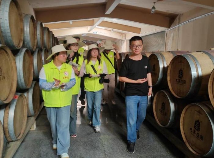 步入九寨莊園葡萄酒窖,張洪首先介紹了地下酒窖的獨特設計。“利用地勢深挖大溝再覆土,形成天然恒溫環境,跟北方地上酒窖比起來,能省下不少能源成本。”實踐團成員觸摸著酒窖墻壁,感受這自然控溫的奇妙之處。負責人又指向入料管道,介紹道:“在酒窖外設置預處理環節,把臟污工序都放在外面完成,能最大程度避免污染酒窖內部環境,保障酒的品質。”
