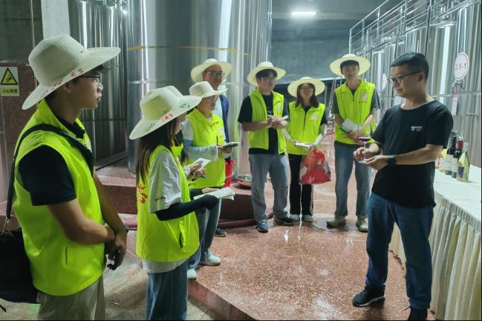 在發酵罐區域,負責人詳細介紹:“這個罐體8000元,帶有盤帶控溫結構,干紅葡萄酒釀造時需要帶皮壓破果實,讓果皮中的色素、單寧等充分融入酒液;干白則要去皮直接壓榨。不同工藝對罐體的使用也有差別。”實踐團成員一邊記錄,一邊向負責人詢問不同酒類發酵時的溫度、時長控制要點。談到發酵工藝選擇,現場展開熱烈討論。張洪認為:“工業生產對穩定性要求高,商品酵母能有效降低微生物污染風險,發酵過程更可控。”但同時他也提出:“自然發酵雖說周期長,可能得1-2個月,還容易出現風味偏差、成本較高,不過中小規模作坊可以借此探索獨特風味,只是得實時監控微生物變化情況。”實踐團成員結合所學知識,積極參與到討論中,提出可根據園區產品定位,嘗試部分批次采用自然發酵,對比市場反饋的建議。