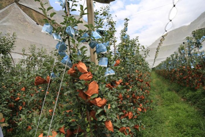 為了讓蘋果兼具品質與顏值,果農們巧用套袋技術—藍色袋子保留果實本色,橙紅色袋子造就“半邊紅”的獨特外觀;樹上方拉起的網格布,是果樹抵御冰雹災害和鳥類啄食的“保護傘”;果農每日用放大鏡檢查葉片,預防紅蜘蛛,則體現著對病蟲害的精細化防控。這些生態種植的優勢,正是實踐團后續為新品種“正名”的重要依據。