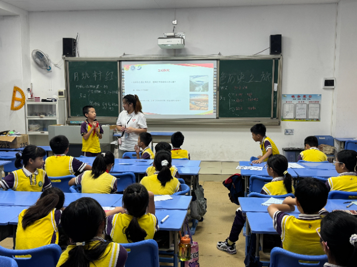 隊(duì)員們?cè)谡n程設(shè)計(jì)中特別注重“聯(lián)古通今”:從月坑村的烽火歲月,講到斗門區(qū)鄉(xiāng)村振興的新貌;從先輩們“為民族獨(dú)立而戰(zhàn)”,談到新時(shí)代“為民族復(fù)興而學(xué)”。當(dāng)小老師展示白蕉鎮(zhèn)如今的稻田畫、生態(tài)農(nóng)場(chǎng)照片時(shí),孩子們恍然大悟:“原來我們現(xiàn)在的幸福生活,就是先輩們奮斗的目標(biāo)!”