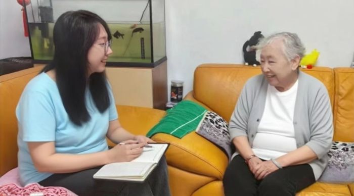圖為團(tuán)隊成員采訪八段錦愛好者張奶奶。門汐蔚供圖