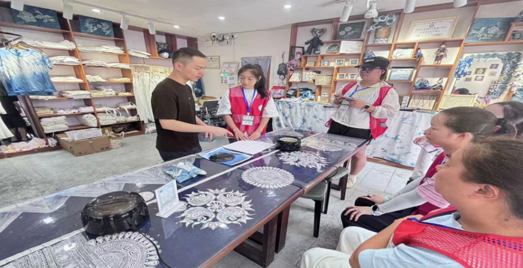 (實踐團成員在非遺傳承人李貴元指導下完成蠟染制作 王宇陽攝)