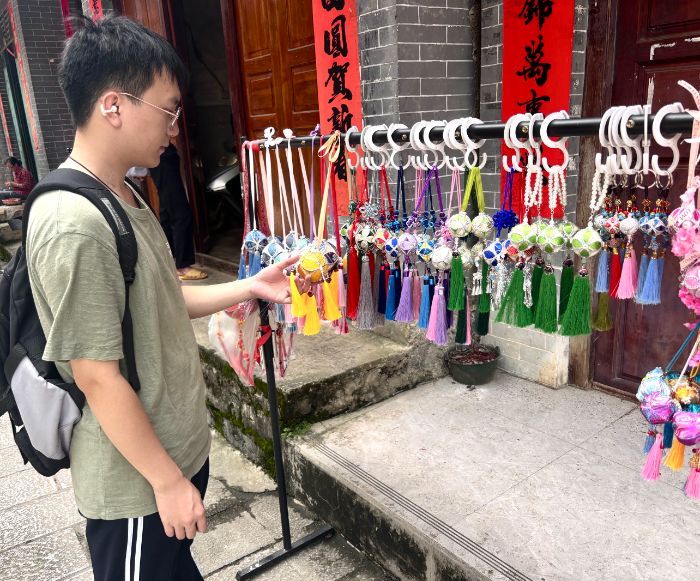 街頭繡球攤“映活力”,見證文旅融合的民生溫度 漫步舊州古鎮繡球風情街,沿街商鋪掛滿色彩艷麗的繡球,72歲的韋奶奶的攤位格外顯眼。韋奶奶指著攤位上的繡球介紹,從20元的迷你掛飾到120元的裝飾繡球,款式多樣,其中與乙游聯名的繡球最受游客青睞,“一天能賣二三十個,年輕人就喜歡這種比較新鮮的樣式。” 團隊在風情街同步開展問卷調研,150余份反饋顯示,80%的游客購買繡球是為了留作紀念或贈送親友,不少人還提出希望增設“繡球制作體驗課”。韋奶奶的攤位,正是舊州“民俗傳承”與“文旅消費”雙向賦能的縮影:手工繡球守住了文化本真,也為居民帶來了穩定收入,生動詮釋了物質文明與精神文明的協同發展。