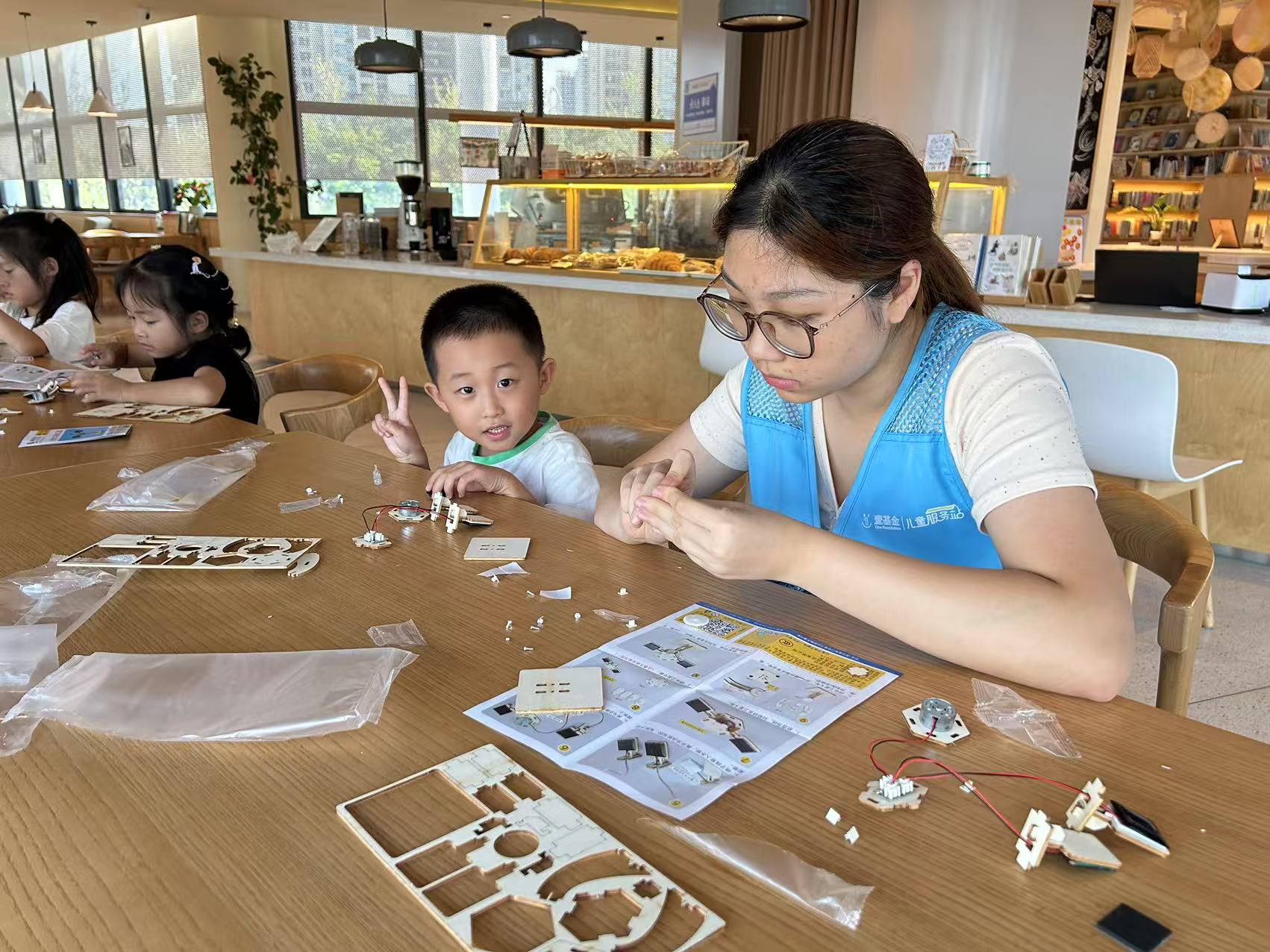 迷你太陽(yáng)能衛(wèi)星手工活動(dòng),作為雙職工家庭托管服務(wù)的常規(guī)內(nèi)容,面向20名6-12歲兒童開(kāi)展,旨在通過(guò)基礎(chǔ)科技體驗(yàn)豐富暑期生活,緩解家長(zhǎng)看護(hù)壓力;顒(dòng)以“科技+動(dòng)手”為核心,通過(guò)趣味性與教育性兼具的實(shí)踐體驗(yàn),讓孩子們?cè)谕嬷袑W(xué)、在做中悟,收獲知識(shí)與成長(zhǎng);顒(dòng)現(xiàn)場(chǎng),身穿藍(lán)色背心的志愿者們有條不紊地分發(fā)手工套件,每套材料均包含預(yù)切割的環(huán)保塑料部件、小型太陽(yáng)能板、齒輪傳動(dòng)裝置等組件。在志愿者的引導(dǎo)下,孩子們化身“小小工程師”,從零開(kāi)始組裝屬于自己的太陽(yáng)能衛(wèi)星模型。他們需獨(dú)立完成太陽(yáng)能板安裝、齒輪嚙合、傳動(dòng)軸連接等步驟,并在完成后將作品置于陽(yáng)光下測(cè)試運(yùn)轉(zhuǎn)效果。“當(dāng)看到我的衛(wèi)星轉(zhuǎn)起來(lái)的時(shí)候,我特別激動(dòng)!原來(lái)太陽(yáng)真的能發(fā)電!”一名參與活動(dòng)的8歲小朋友興奮地分享道。在陽(yáng)光照射下,孩子們親手制作的小衛(wèi)星緩緩旋轉(zhuǎn),螺旋槳輕盈擺動(dòng),光能轉(zhuǎn)化為動(dòng)能的奇妙過(guò)程讓現(xiàn)場(chǎng)充滿(mǎn)驚嘆與掌聲。當(dāng)遇到部件卡接不牢、線(xiàn)路接觸不良或齒輪卡頓等問(wèn)題時(shí),志愿者提供一對(duì)一指導(dǎo),幫助孩子分析原因、動(dòng)手調(diào)整,有效提升了他們的耐心、專(zhuān)注力與手眼協(xié)調(diào)能力。“孩子平時(shí)在家總看平板,這次不僅能動(dòng)手,還能學(xué)到太陽(yáng)能的知識(shí),特別有意義。”一位下班后前來(lái)接孩子的家長(zhǎng)表示,“托管服務(wù)既安全又豐富,讓我們能安心工作,真的幫了大忙。”