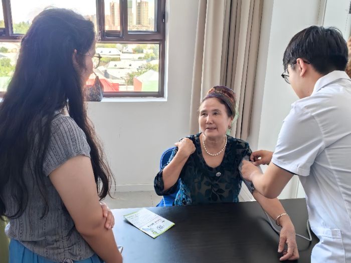 實踐隊首先來到伊寧市總醫院伊犁河路街道分院,與醫務人員研討公共衛生政策落地和實地學習基層醫療體系,同時開展健康宣講與義診服務,推動健康知識入腦入心、落地生根。