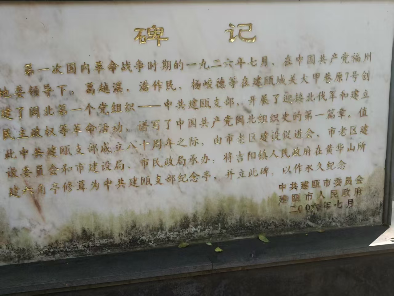 在紀念碑前,李博軒仔細閱讀碑記,了解到在第一次國內革命戰爭時期的1926年7月,葛越溪、潘作民、楊峻德等同志在中國共產黨福州地委領導下,在建甌城關大甲巷原7號創建了閩北第一個黨組織——中共建甌支部,開展了迎接北伐軍和建立民主政權等革命活動,譜寫了中國共產黨閩北組織史的第一篇章。