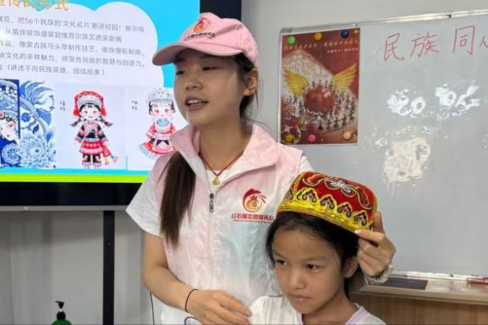 活動期間,志愿者采用圖文結合的方式,向參與群體介紹苗族、維吾爾族、蒙古族、傣族等少數(shù)民族的服飾特點、傳統(tǒng)節(jié)日及非物質文化遺產技藝。在雙語互動環(huán)節(jié),志愿者教授維吾爾語問候語“亞克西姆賽斯”(意為“你好”),引導學生跟讀與模仿。