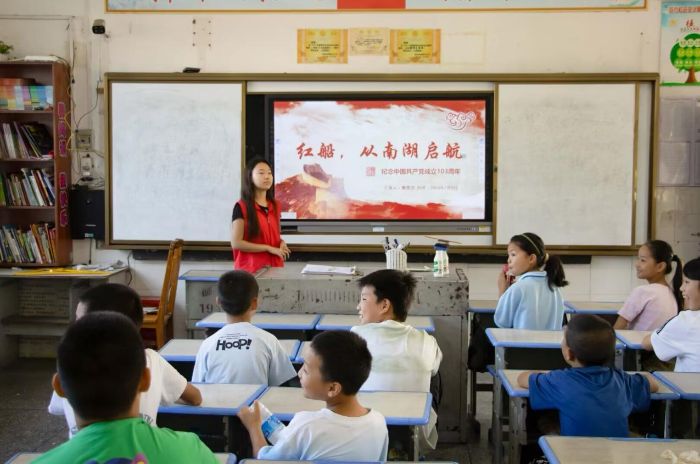 實踐隊員姚孟琳為同學們帶來的紅色朗誦課堂《紅船精神》,字字鏗鏘、聲聲有力,標準流利的普通話盡顯語言魅力。孩子們齊聲跟讀,稚嫩的嗓音里滿是認真,仿佛那艘承載著初心與使命的紅船,正緩緩駛過歷史的長河,在眼前重現。這堂特殊的朗誦課,不僅讓孩子們在跟讀中提升了普通話素養,更在紅色故事的浸潤中,悄然播下了紅色精神的種子。
