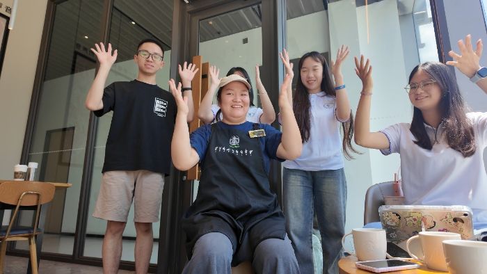 當日午后,團隊來到星巴克寧波日報手語店,通過手寫板、語言轉文字軟件與聽障咖啡師交流?Х葞煷捍悍窒“因聽不見更專注工作”的心得及與熟客的默契瞬間,團隊也發現,顧客的耐心與善意比線上點單系統、語音翻譯機更能拉近距離。實踐尾聲,成員學手語“歡迎你們來到寧波日報手語店”,感受平等善意。