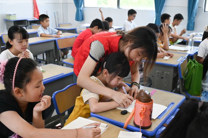 圖為志愿者糾正握筆姿勢 楊貝熙攝 醫路童行志愿隊此次鄖西縣王家坪村暑期“三下鄉”支教行動,將高校學子的知識技能轉化為服務鄉村的切實行動。一位支教隊員感言:“看到孩子們對知識的渴望和參與活動的熱情,我們更加體會到‘學以致用’的價值。我們不僅希望豐富他們的暑期時光,更期盼這些健康知識和文化體驗能成為陪伴他們成長的‘好朋友’。”當防治知識融入童真日常,當筆墨紙硯邂逅稚嫩小手,當操場躍動青春身影,醫路童行志愿者們用專業與熱情,在鄖西孩子們的心田種下健康與希望的種子。這些跨越山水的陪伴,不僅裝點了鄉村孩子的暑期記憶,更為鄉村教育注入了新的活力。