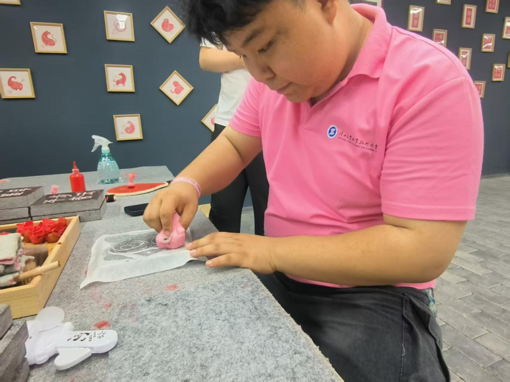 扎染區域,藍白織物經捆扎、浸染,暈染出獨特圖案,郭雯妍同學和倪韓蕊同學沉醉于傳統技藝與自然融合的美學;漆傘制作時,張老師和車老師參與層層點染,感受漆藝的細膩厚重;石刻體驗選桃子題材,馬旭陽同學和謝雨萌同學握刀鑿石,讓力量借刀鋒傳遞,刻下線條間,觸碰歷史與當下的共振;拓印環節以猴子為樣,陳東同學先用墨汁浸潤宣紙,再捶打間古老紋理重現,“對話”歲月痕跡。