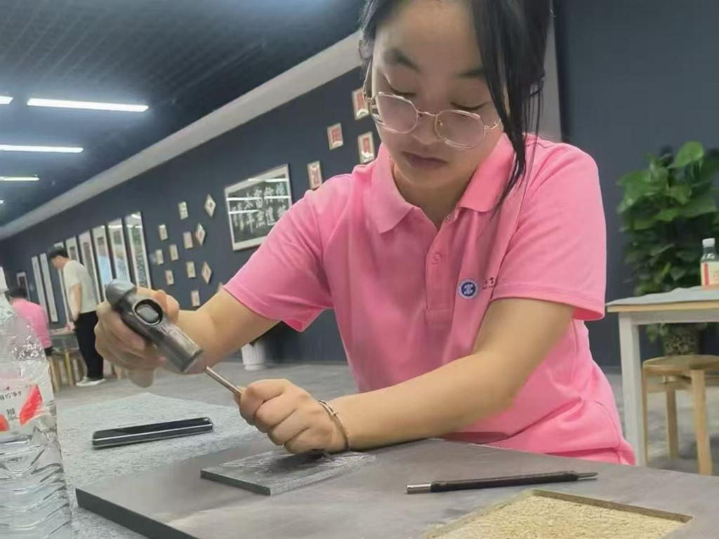 謝玉萌同學在專注石刻體驗。(馬旭陽供圖)
