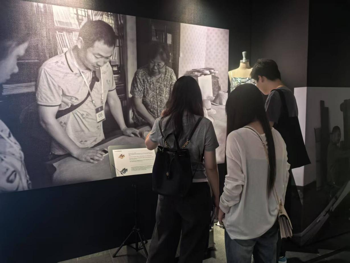 移步至老照片與實物結合區,大家俯身細觀。泛黃影像里匠人們專注神態,搭配眼前絲綢制品,紋理藏著歲月故事。