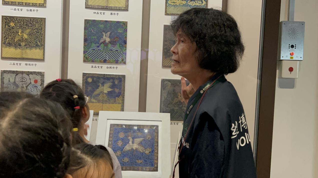 為了更深入了解絲綢文化,團隊還邀請了蘇州博物館的志愿者吳阿姨進行講解。吳阿姨指著一件緙絲作品介紹道:“緙絲技藝十分獨特,采用‘通經斷緯’的方法織造,能織出正反兩面如一的精美圖案 ,這也是它被譽為‘織中之圣’的原因。”在吳阿姨的講解下,團隊成員們對絲綢技藝有了更深刻的認識。她又指著古老織機,講述“清代紡工序列圖”,從煮繭、繅絲到織綢,工序如歷史脈絡鋪展;面對官服補子展板,又詳解一品仙鶴、二品錦雞等紋樣的品級寓意,孩子們聽得入神。文物不再是冰冷展品,經講解串聯起往昔,讓絲綢文化的技藝傳承與規制智慧,借講解流入參觀者心間,延續著千年絲韻的溫度 。