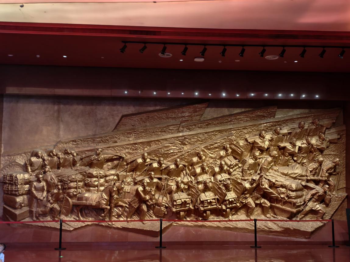 薪火新傳:當藝術賦能紅色基因。在淮海戰役紀念館序廳,浮雕中沖鋒戰士的肌肉線條,隱喻"不屈的民族脊梁";波濤紋飾象征"人民力量如江海奔涌"。