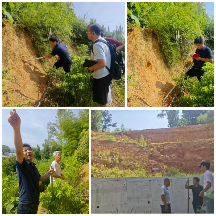 在李德營教授的帶領下,團隊聚焦具體地質(zhì)災害風險區(qū)開展了詳細調(diào)查。上午,團隊前往天城鎮(zhèn)謝家坳村金阿姨家房屋切坡進行實地調(diào)查。李老師現(xiàn)場親自指導成員們進行調(diào)查工作,大家認真地調(diào)查邊坡形態(tài)、規(guī)模、坡度、斜坡結(jié)構(gòu)、地層巖性、巖土體強度、邊坡變形等情況,繪制了工程地質(zhì)剖面圖。同時,成員們還與村民親切交流,詳細詢問房屋的建設時間、經(jīng)歷過的滑坡險情以及汛期邊坡變形特征,為分析切坡建房地質(zhì)災害風險積累了寶貴的第一手數(shù)據(jù)。