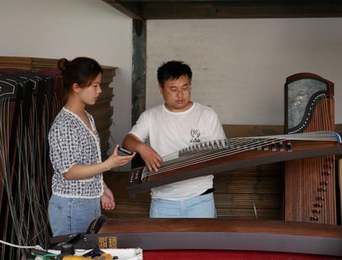 進(jìn)入樂器生產(chǎn)加工車間后,團(tuán)隊(duì)成員被員工制作樂器的過程深深吸引。一個個半成品經(jīng)由他們之手,逐一進(jìn)行打漆、烘干、打磨,然后裝弦、調(diào)音,最終變成了一臺臺嶄新的樂器。在團(tuán)隊(duì)成員驚訝于員工精湛的技藝之際,老板順手拿出一臺古箏,反手一撥,順手一挑,便現(xiàn)場演奏了一曲《滄海一聲笑》。行云流水般的樂聲亦揚(yáng)亦挫,深沉、婉轉(zhuǎn)而不失激昂。