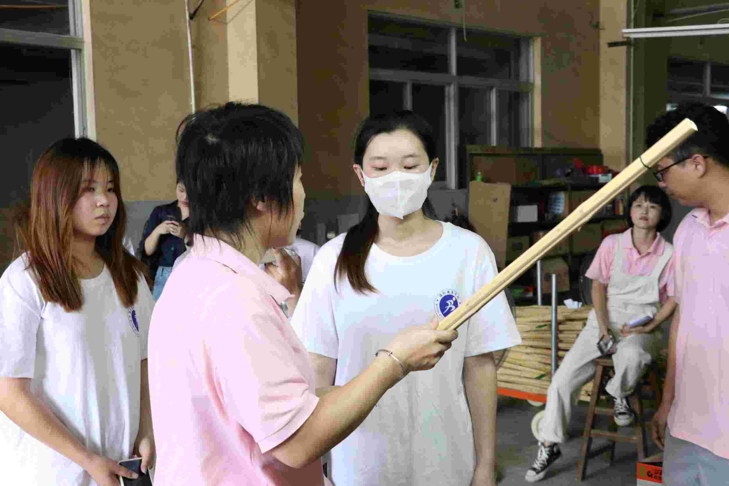 兩岸共“竹”夢實踐隊員跟隨工作人員參觀了竹劍制作的流水線全過程,現場了解了竹子的選擇運輸、打磨修剪,稱重檢查。竹劍的制作是一個對于質量要求較高的過程,做一支竹劍要經過選材,烤火,定型,打蠟等20多道工序,重量要控制在410克--480克之間,一條生產線大概需要10-12人。不管是對于竹片的重量,還是竹片的縫合程度,一步一步,精益求精,每一個環節無不體現其匠人精神。