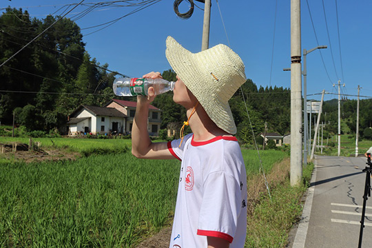 圖為一名團隊成員在除完雜草并清完水渠之后大口喝水的畫面,她的臉上躺著豆大的汗滴。