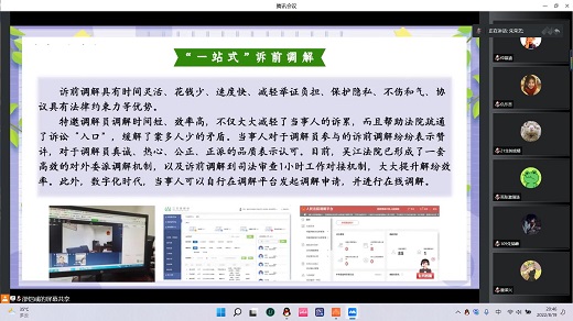 最后一部分是由朱同學介紹蘇州市吳江區法院的品牌項目——“幸福港灣”婚姻家事巡回審判驛站,主要從“幸福港灣”概覽、“一站式”訴前調解的特點以及巡回審判現場三方面展開。吳江法院在吳江區六個鄉鎮掛牌“幸福港灣”婚姻家事巡回審判驛站,通過巡回審判,實現審理一案、教育一片的法律效果和社會效果。吳江法院圍繞將“婚姻家庭矛盾化解在基層,解決在萌芽,實現訴源治理,構建和諧社會”的總目標,與司法所、婦聯簽訂備忘錄,落實訴調對接、法治宣傳等各項協作共建工作。