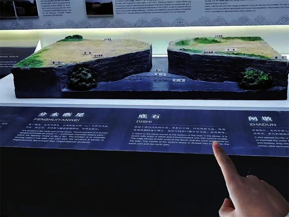 實(shí)踐隊(duì)員進(jìn)入博物館,映入眼簾的便是一艘木帆船,腳下是透明的玻璃,近看發(fā)現(xiàn)坡璃下還流著清澈的水,四周映射出五顧方色的燈光,仿佛置身在大運(yùn)河中。處在大廳正中央,是一座生動(dòng)形象的聊城水城水系電子互動(dòng)沙盤。實(shí)踐隊(duì)員乘電梯到博物館四層,才可把沙盤風(fēng)景盡收眼底,藍(lán)水綠地,有運(yùn)河流過的地方到處都是蒼翠欲滴。再一次詮釋了“運(yùn)河成就聊城”的佳話。博物館共分為三個(gè)展廳,分別為“史前時(shí)期展廳”“商周秦漢-魏晉隋唐展廳”“宋遼金元-近現(xiàn)代展廳”,其中陳列著國家一級文物有磨喝樂宋代陶模、宋金線紋罐以及金鶴壁窯黑釉雙系凸線紋罐、漢羊首陶瓶、金龍泉窯瓷香爐、清釋迦摩尼佛、清圓雕白玉臥馬等文物,這都得益于城鎮(zhèn)建設(shè)與運(yùn)河開發(fā)保護(hù)。