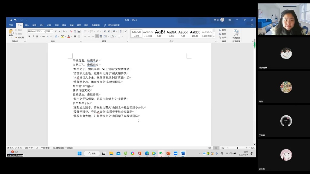 在先前討論總結(jié)出的實(shí)踐背景、實(shí)踐目的和實(shí)踐方式的基礎(chǔ)上,隊(duì)長(zhǎng)曾潔總體把握本次社會(huì)實(shí)踐主要脈絡(luò)和基本方向,確定本次社會(huì)實(shí)踐的線下實(shí)踐時(shí)間。隨后各位隊(duì)員分別闡釋自己的優(yōu)勢(shì),隊(duì)長(zhǎng)據(jù)此安排劉春妍等七位隊(duì)友負(fù)責(zé)儒家文化稿件撰寫,安排丁萍負(fù)責(zé)QQ空間和微博網(wǎng)站的投稿,安排張嘉慧、楊欣蕊負(fù)責(zé)中青網(wǎng)等1000字以上要求的投稿,家鄉(xiāng)文化的稿子由每位隊(duì)員自己撰寫。隊(duì)長(zhǎng)提醒,對(duì)于儒家文化和家鄉(xiāng)文化的講述都不要太生硬,盡量以故事、視頻形式呈現(xiàn)。至此,曲阜師范大學(xué)“杏壇春雨入鄉(xiāng)土,犁牛勤耕承鄉(xiāng)髓”實(shí)踐小組第二次線上會(huì)議圓滿結(jié)束。