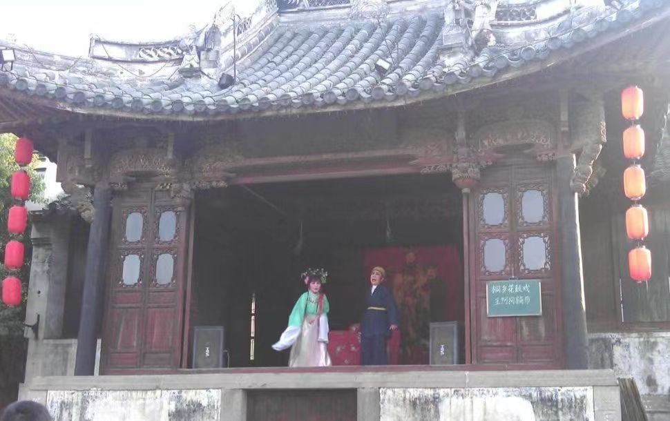實踐隊從當地一些店主口中得知,古戲臺從早上八點一直到晚上十點,每逢整點都有一場演出,大多數時候來觀看的人比較少,但是疫情放開以后,明顯比以前熱鬧了一些。然而由于場地露天,沒有設置觀眾席,想要看戲只能站著或者自己搬椅子來坐,再加上來烏鎮看戲的大多是游客為主,人多時總有喧嘩聲,這就導致戲臺前很少有人愿意耐心地聽完一場戲。實踐隊隊員在臺前駐足不到半小時,來來往往的人便已換走了一大半。桐鄉花鼓戲相較于越劇,腔調更加活潑,情節上也更加樸實純粹,演唱采用桐鄉本地方言,更加貼近百姓生活。其劇目有《還披風》《庵堂相會》《摘石榴》等,劇情多為合家歡樂,體現人與人之間友好相處的仁愛之情。