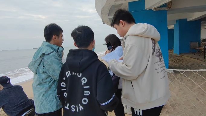 下午四時許,經過前期休息調整,隊員們來到前江灣海灘邊,沿著海濱路對過往群眾進行訪談及發放問卷。群眾大多積極配合,認真回答問卷上的問題——諸如對于海鮮保存食用方法的了解程度、對于海鮮產品的食用頻率、喜愛程度以及對于海鮮產品(產業)的建議等。在與群眾積極交流中,隊員們除了對群眾海鮮食品的調研情況有深入的了解之外,也進行了一定的科普活動。