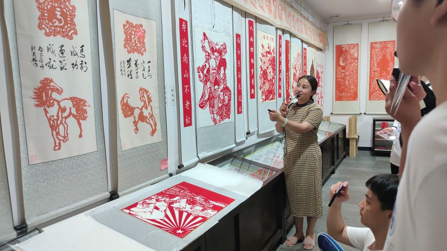 圖為剪紙館管理員為“三公”志愿者團介紹剪紙文化(周可 攝)
