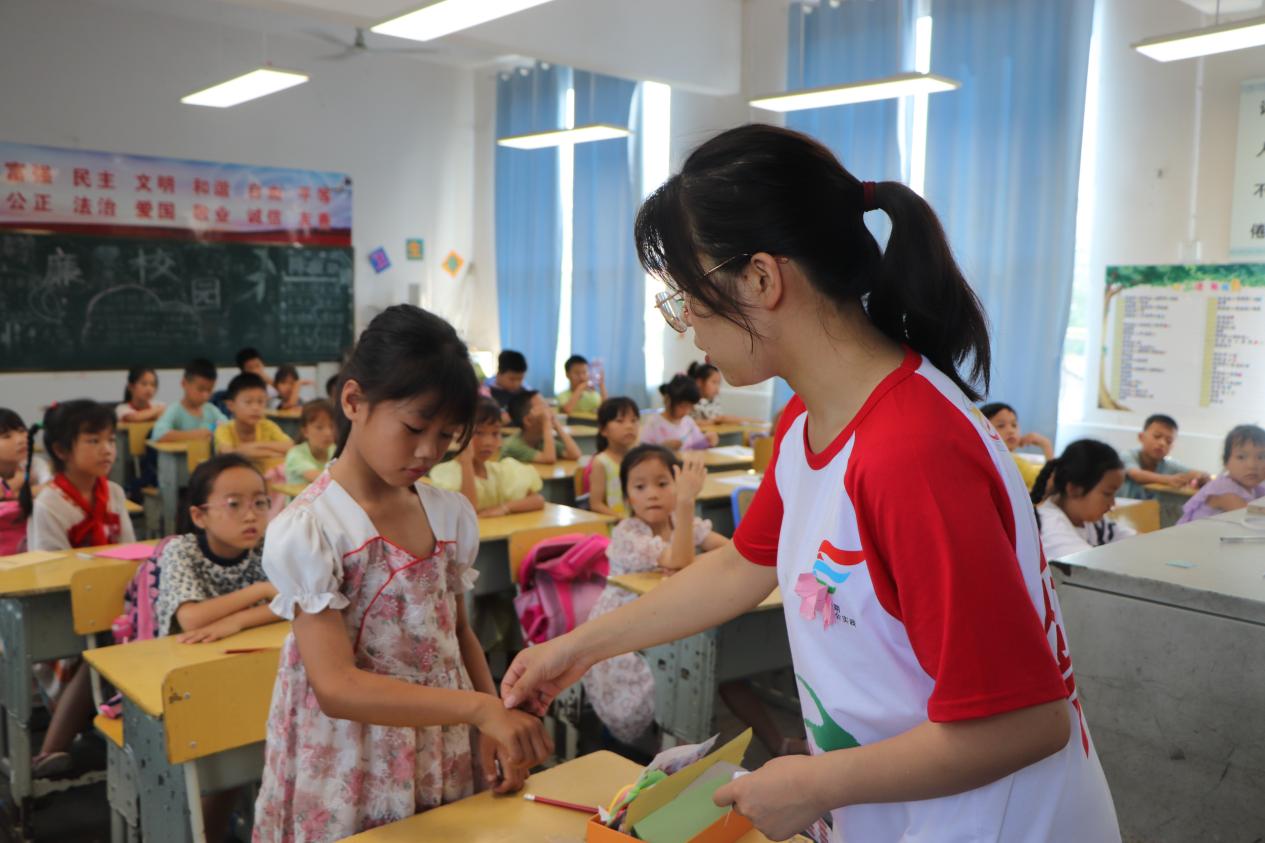 (圖為在課堂上志愿者獎勵孩子貼紙)