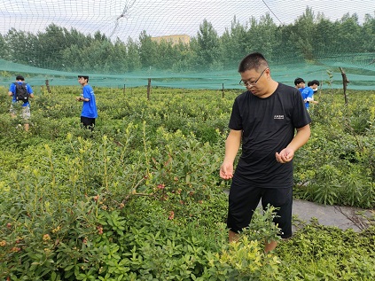 燦爛的陽光下,在果園負責人的帶領下,實踐團成員先參觀了其園內環境,開始了本次活動。在接下來的時間里,實踐團成員親身采摘藍莓,體驗果園職工們的工作生活,通過深入感受工人師傅工作中的艱辛困難,堅定實踐團成員深入人民,扎根人民的志向,堅定奉獻吃苦在前,安逸享樂在后的理想信念。放眼望去,一排排低矮的藍莓樹連綿成片,一顆顆碩大豐腴的藍莓成串兒掛在枝頭。園主熱情的拿出園中剛摘下的藍莓給我們品嘗,絲絲梨水入口香甜,實踐團成員們贊不絕口。