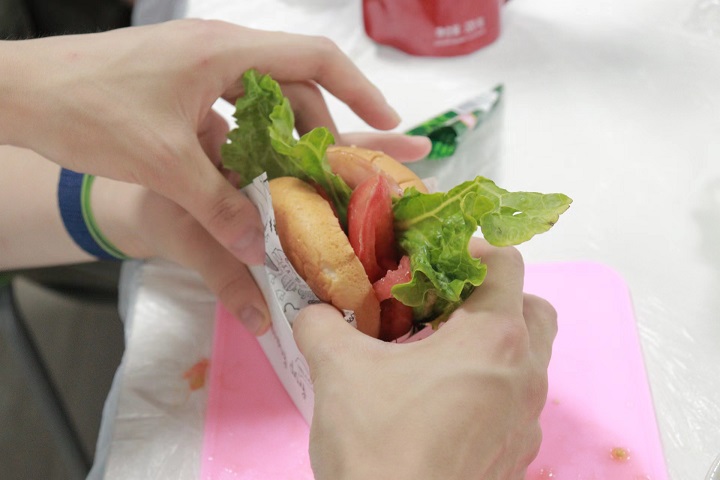 圖為志愿者幫助星寶包裝漢堡。多彩大學(xué)生網(wǎng) 通訊員 黃怡 攝