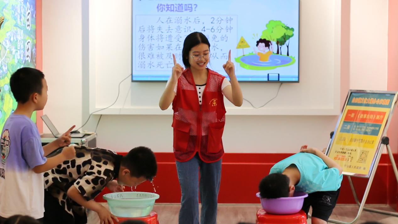 此外,實踐團成員還向同學們傳授安全有效的防溺水措施,提高學生遇險時的自救能力。通過一場簡易的防溺水實操演練,讓其親身體驗,進一步加深孩子們對于防溺水的安全意識。參與演練的小卓同學分享道,“溺水時感覺心里悶悶的,呼吸不過來。”他表示,自己學會了遇險緊急措施,并意識到私自下水是十分危險的行為,應該把生命放在首位。