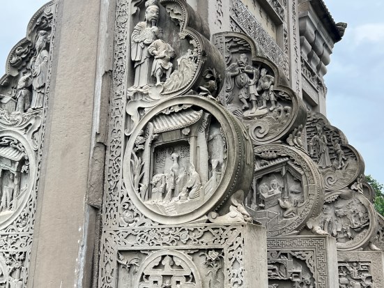 走近看,浮雕的深度不一,生動形象的刻畫了冉八老爺的生平事跡。屋檐上的瓦片,片片精致,彎曲的曲線猶如冉八老爺的住所就在眼前;浮雕中人物的神態、服飾及其細致,盡管受到了歲月的沖刷,但仍能看出冉八老爺所經歷的各種世事。難以想象,在一百多年前,此種工藝是如何達到如此的精美細致,并實現了對稱之美,放在科技發達的現在有如此精美的工藝,也是非常地令人驚嘆。