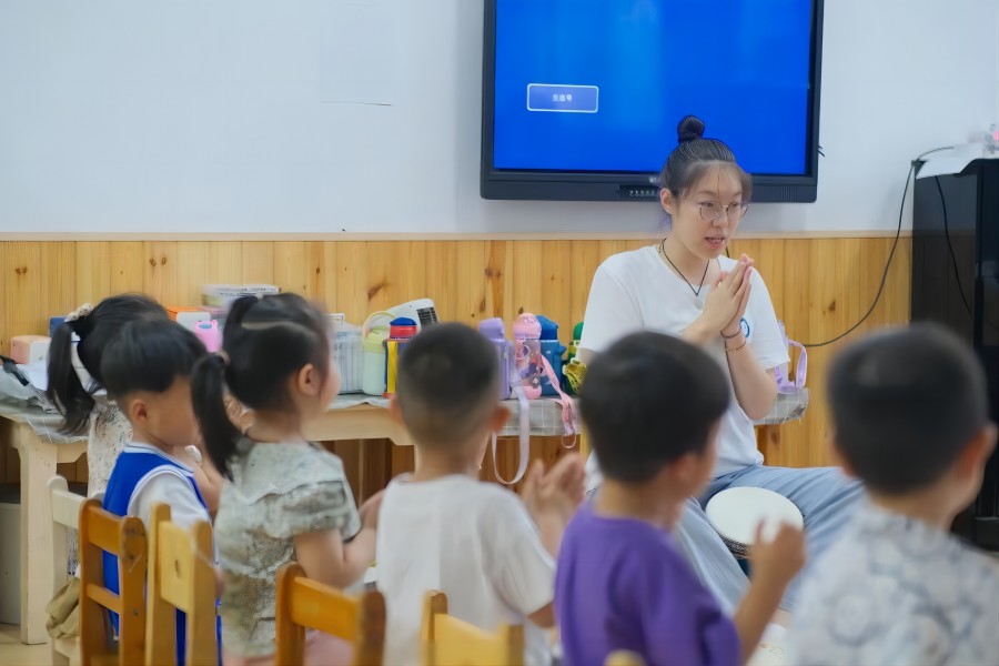 中班進行的是大鼓教學,繼續前一天的《大鼓小鼓》教學,讓孩子們精準跟著節奏敲鼓,并且在前一天學習的基礎上,讓孩子們加入自己的情緒,快樂,開心的心情表露在臉上,孩子們一遍又一遍,完全沒有懈怠,跟著老師的步伐有序的進行學習,讓孩子們能夠分清音的強弱和高低,對大鼓進行深入的學習,不局限于簡單的敲鼓。孩子們樂于接受老師的教學,并且展現出對敲鼓的興趣。