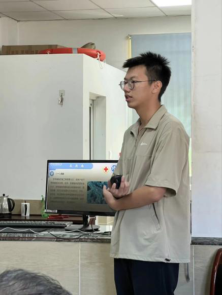 實踐隊與東山縣紅十字會提前聯系,協商講座安排,并請紅會人員邀請漁民參與。在本次講座中,實踐隊成員陳若凡從漁業職業病的種類及成因、防患措施、早期癥狀、現行治療方法、愈后等方面,結合自身醫學生身份發表見解與感想,回答漁民與講座相關的問題。在講座結束后,隊員及紅會成員與隨機采訪三位漁民,了解講座舉辦成效,進行集體合影留念,并在漁民離開后及時清理場地。