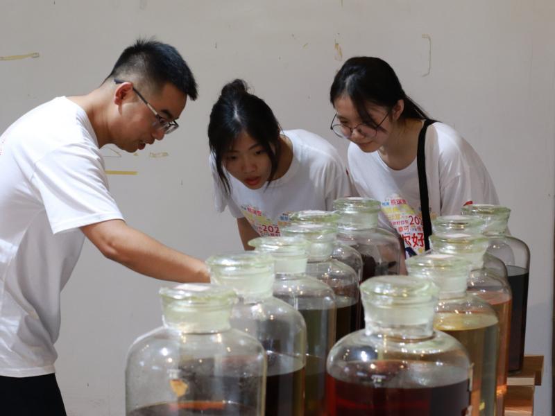 朱廠長首先帶領三下鄉小隊參觀釀酒工作間,并熱情的為隊員們介紹有關竹酒的各種知識。走進工作間,一股竹子的清香就鋪面而來,在朱廠長的介紹下,得知竹酒就是用竹子與糠殼混合發酵釀造的,不同種類的竹酒,需要發酵的時間也不一樣。之后朱廠長熱情地邀請隊員們品嘗已釀好的清香型與濃香型的竹酒。品嘗后,不少隊員表示竹酒聞起來香氣四溢,喝起來回味無窮。緊接著,朱廠長帶隊員們前往藏酒的酒窖,那里存放著“竹之釀”、“活之釀”、“調味酒”三種酒,其中最長的酒已經有三十年了。