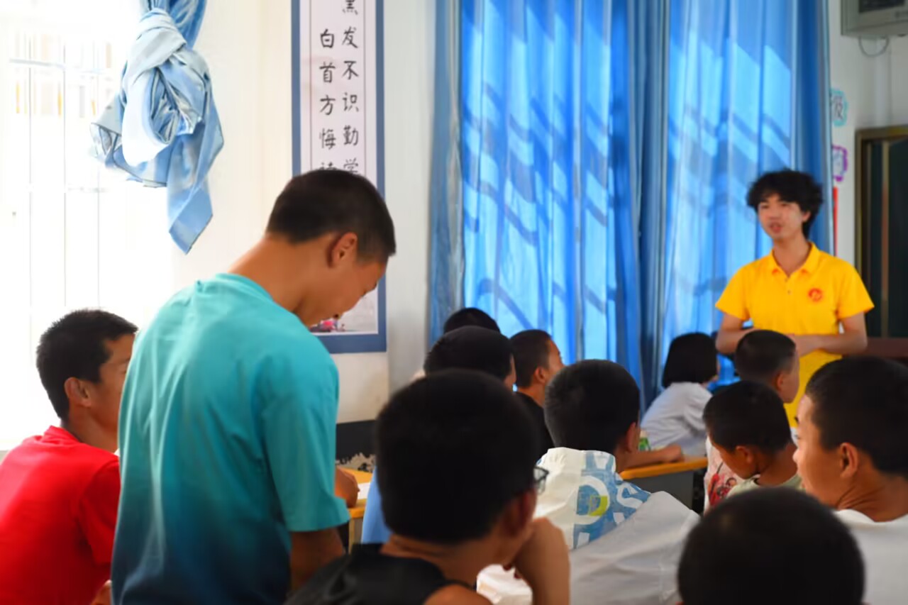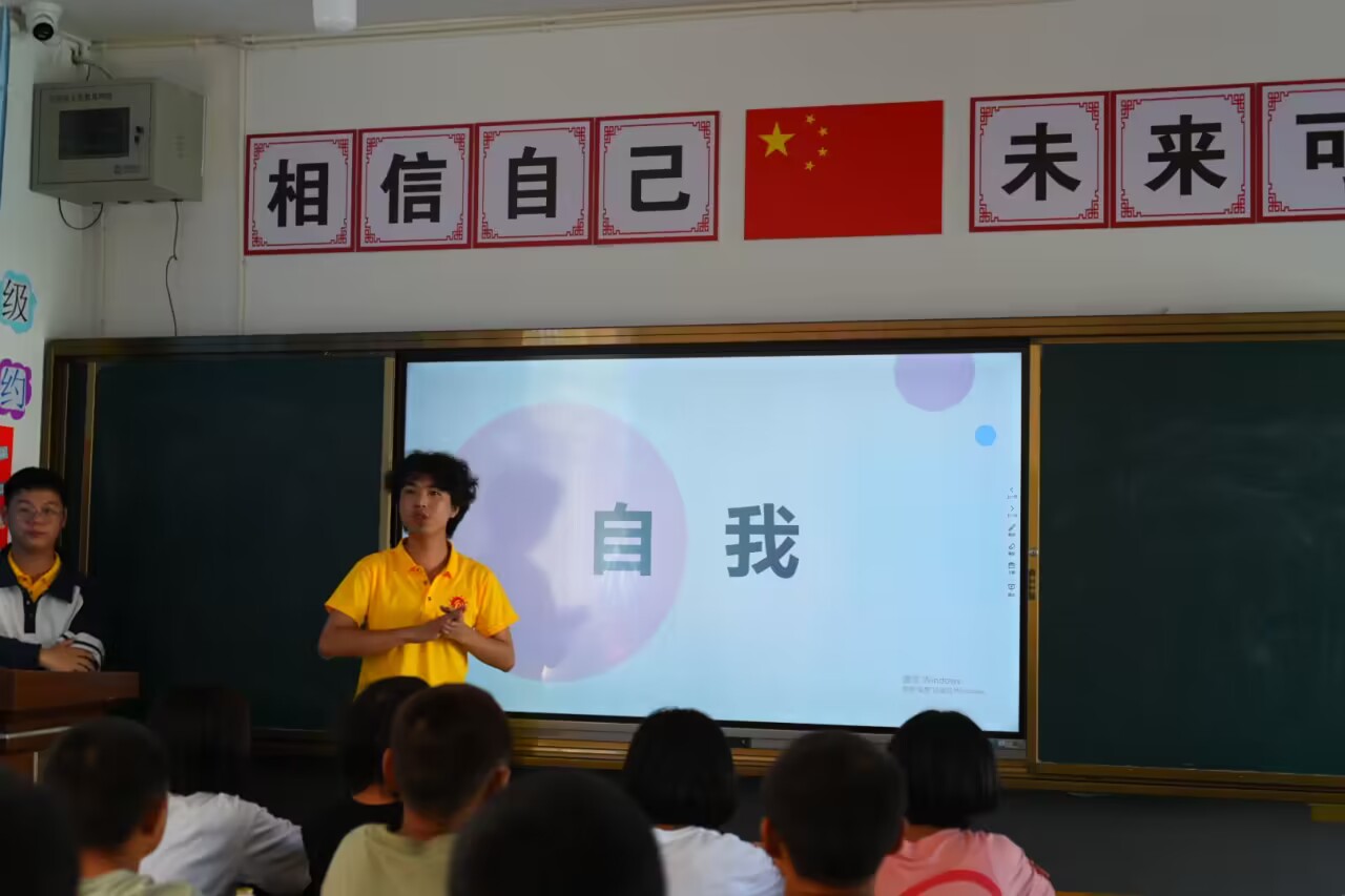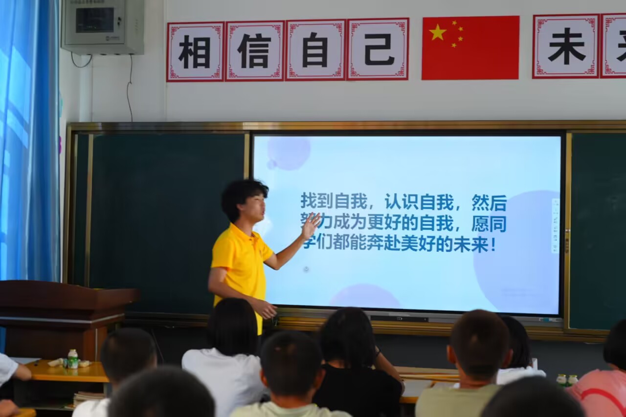 圖為“緣善”社會實踐隊隊員楊英豪與望程學校同學們開展關于“自我”的話題討論。通訊員 朱廣林 攝