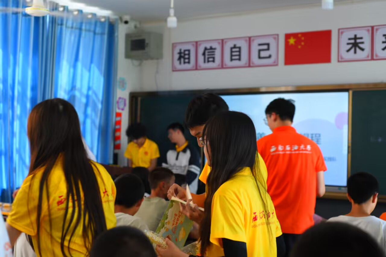 圖為隊員向望程學校同學們分發零食以及活動用具。通訊員 朱廣林 攝